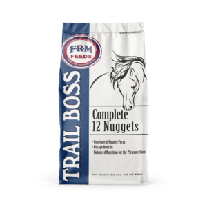 F-R-M Trail Boss Complete 12 Nuggets may be fed as only feed at rate of 1.5 – 2.0 pounds per 100 pounds of body weight. Recommended to feed at least 2 – 3 pounds of long stem roughage per day to minimize vices such as wood chewing and tail chewing.